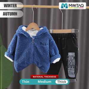 Warm Comfy Blue Hooded Zipper Jacket With Black Jeans Set