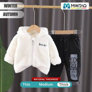 Warm Comfy White Hooded Zipper Jacket With Black Denim Set